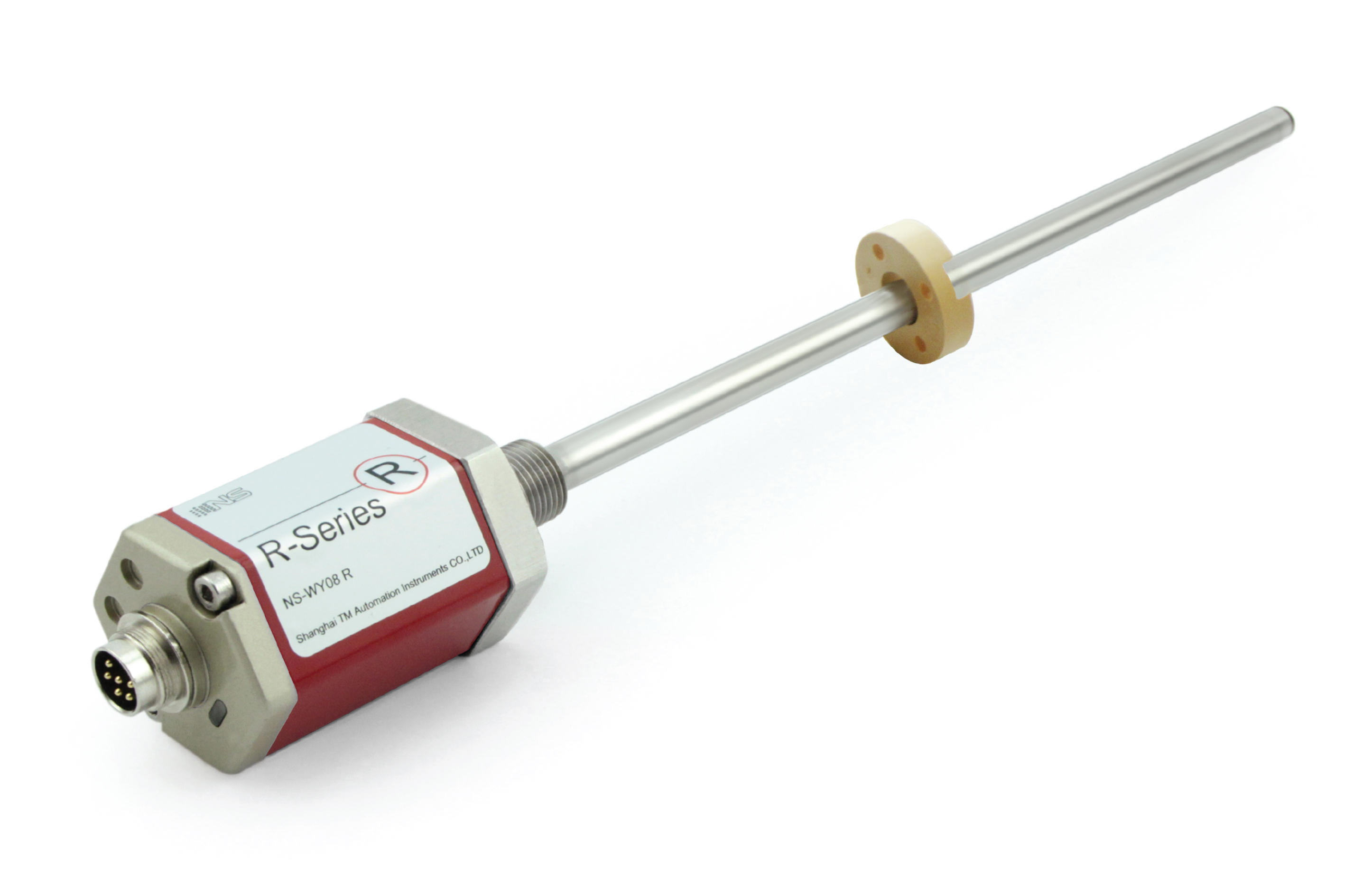 測(cè)量元件是一根波導(dǎo)管,波導(dǎo)管內(nèi)的敏感元件由特殊的磁致伸縮材料制成的。測(cè)量過程是由傳感器的電子室內(nèi)產(chǎn)生電流脈沖,該電流脈沖在波導(dǎo)管內(nèi)傳輸,從而在波導(dǎo)管外產(chǎn)生一個(gè)圓周磁場(chǎng),當(dāng)該磁場(chǎng)和套在波導(dǎo)管上作為位置變化的活動(dòng)磁環(huán)產(chǎn)生的磁場(chǎng)相交時(shí),由于磁致伸縮的作用,波導(dǎo)管內(nèi)會(huì)產(chǎn)生一個(gè)應(yīng)變機(jī)械波脈沖信號(hào),這個(gè)應(yīng)變機(jī)械波脈沖信號(hào)以固定的聲音速度傳輸,并很快被電子室所檢測(cè)到。
